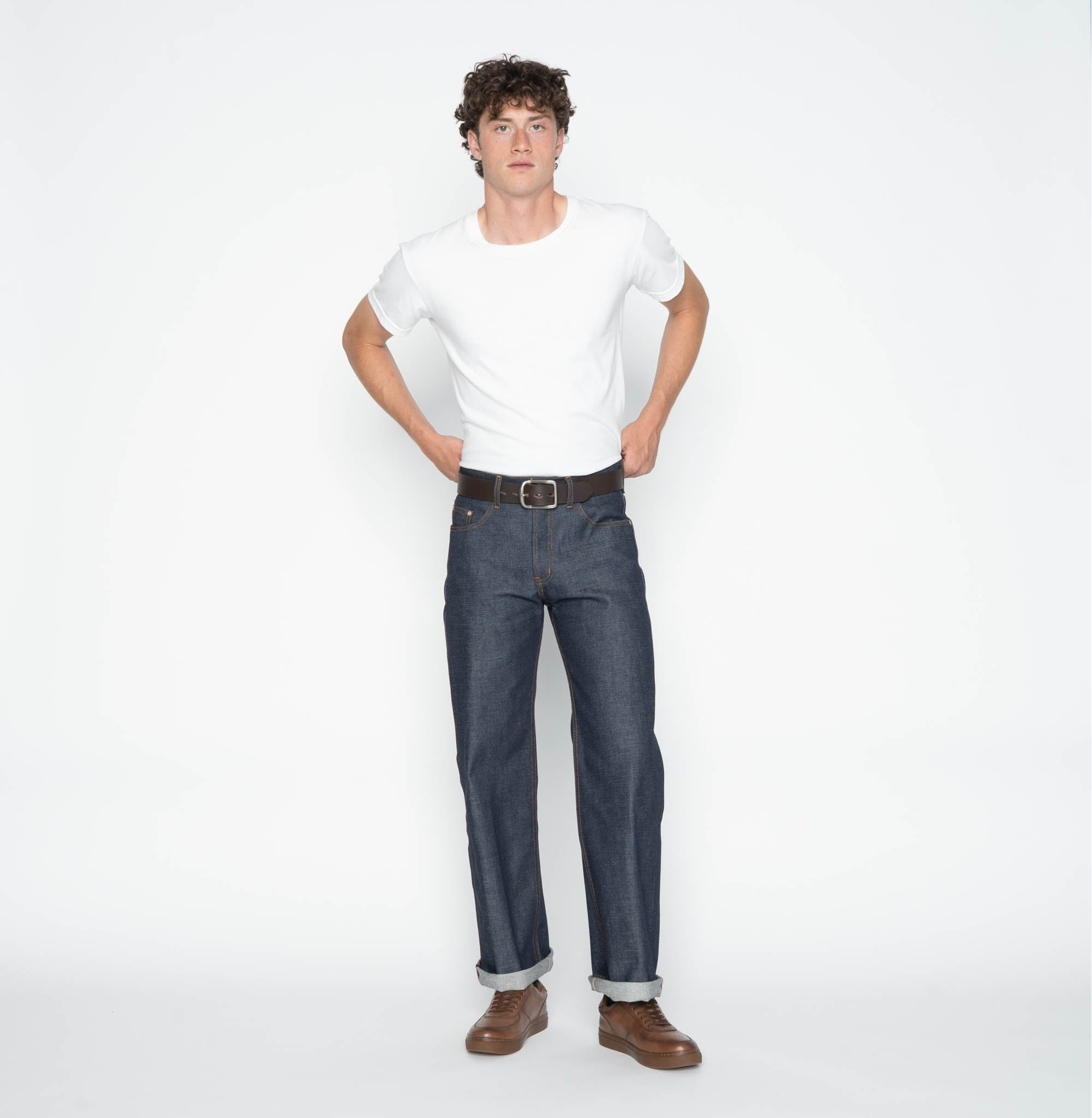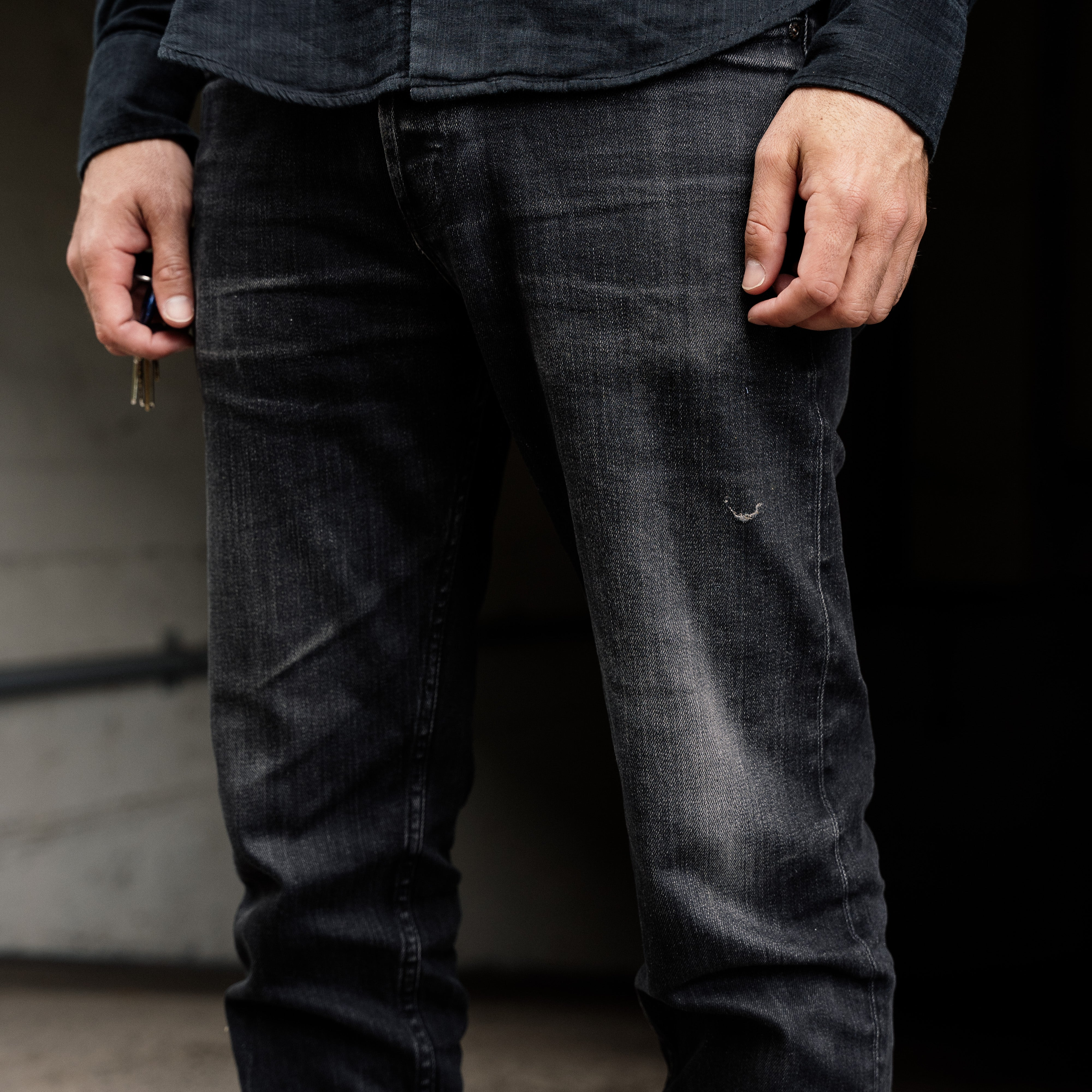 A brand new pair of Weird Guy in Natural Indigo Selvedge stands on the left; on the right, the same jeans after months of wear. These fades aren’t pre-made in a factory, they’re the result of daily life. Each pair develops its own whiskers, honeycombs, and shades, becoming a reflection of its owner.