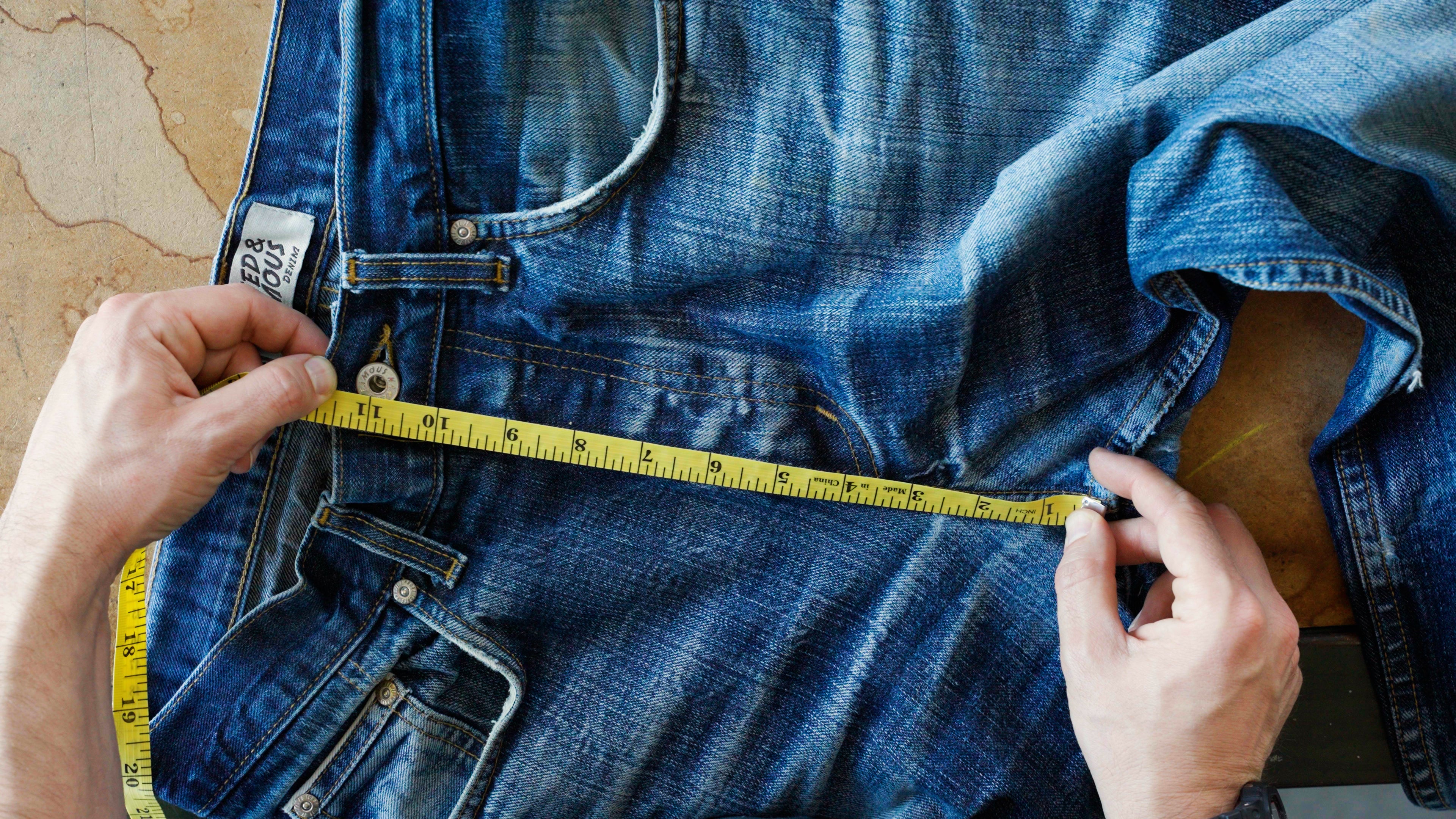- 2 Lay the jean out flat with the top front edge of the waistband even with the top back edge of the waistband. Pull tightly.