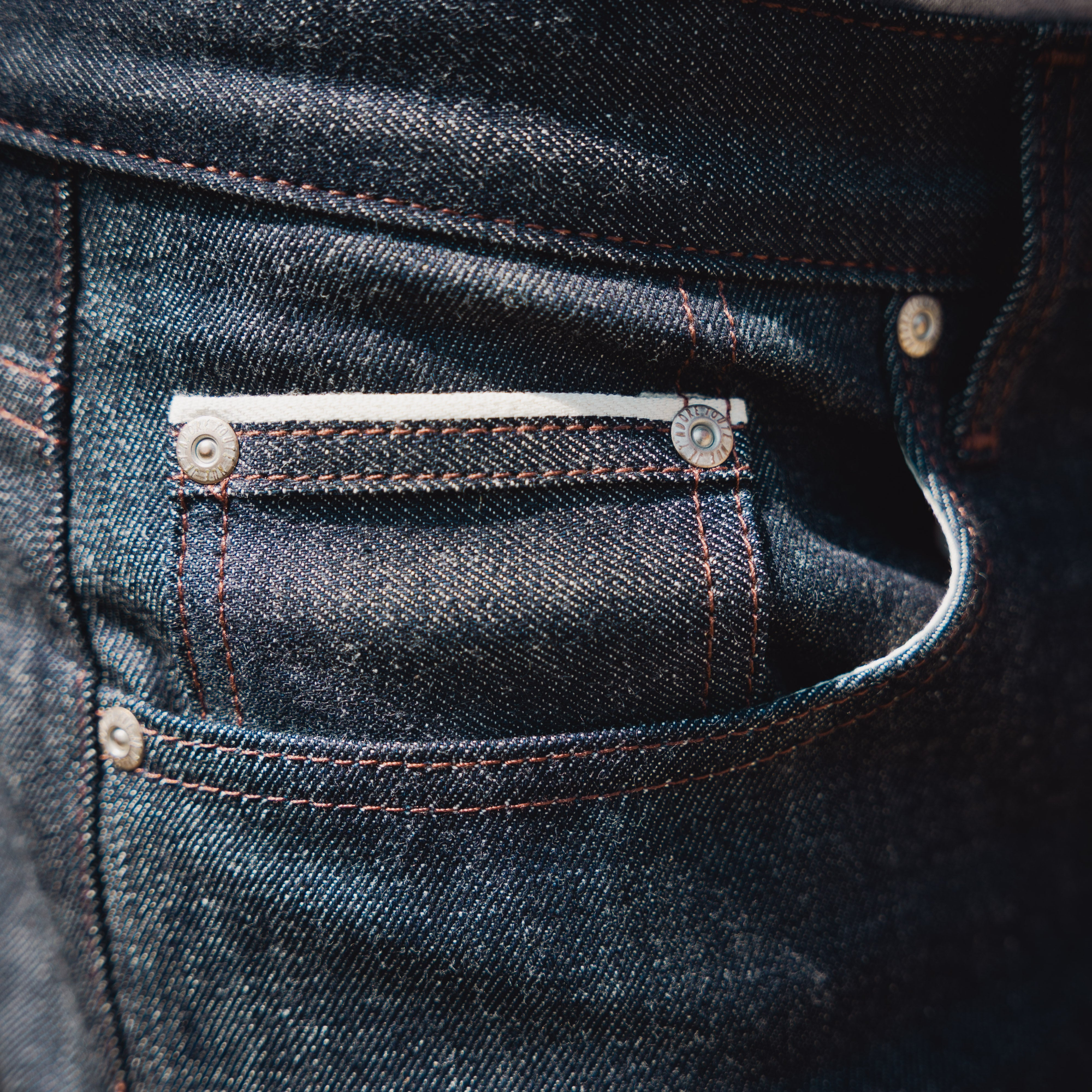 Product of shuttle loom weaving—a tightly finished edge that prevents fraying and defines the full usable width of the fabric. Nowadays, it’s also a clear indicator that the fabric wasn’t mass-produced on high-speed, wide-width looms. If there’s a selvedge, it means the denim came from a traditional, narrow shuttle loom—machines that operate slowly, under low tension, and require more setup and operator involvement.