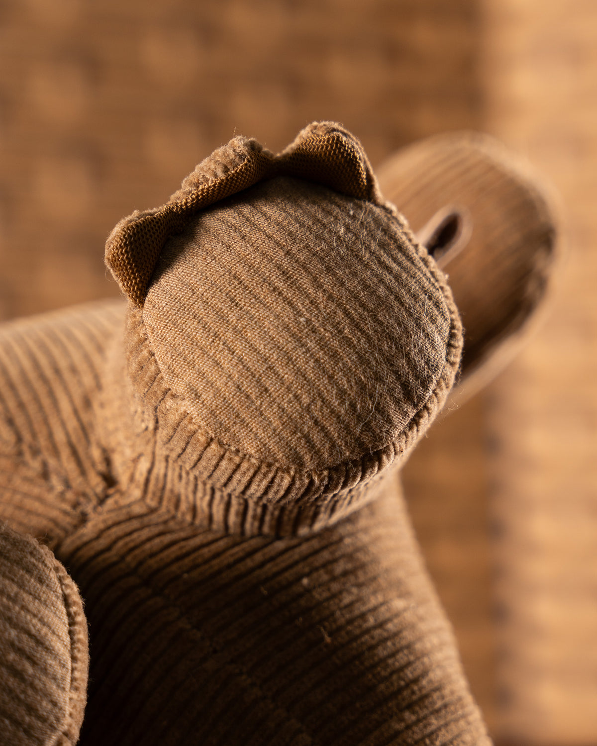 Kon Kon is constructed from naturally colored brown FoxFibre® Japanese selvedge corduroy, showing the raw brown tone of the fiber itself without the use of dyes. The fabric’s color and texture are inherent to the cotton and designed to develop depth and patina through handling, exposure, and hugging over time.