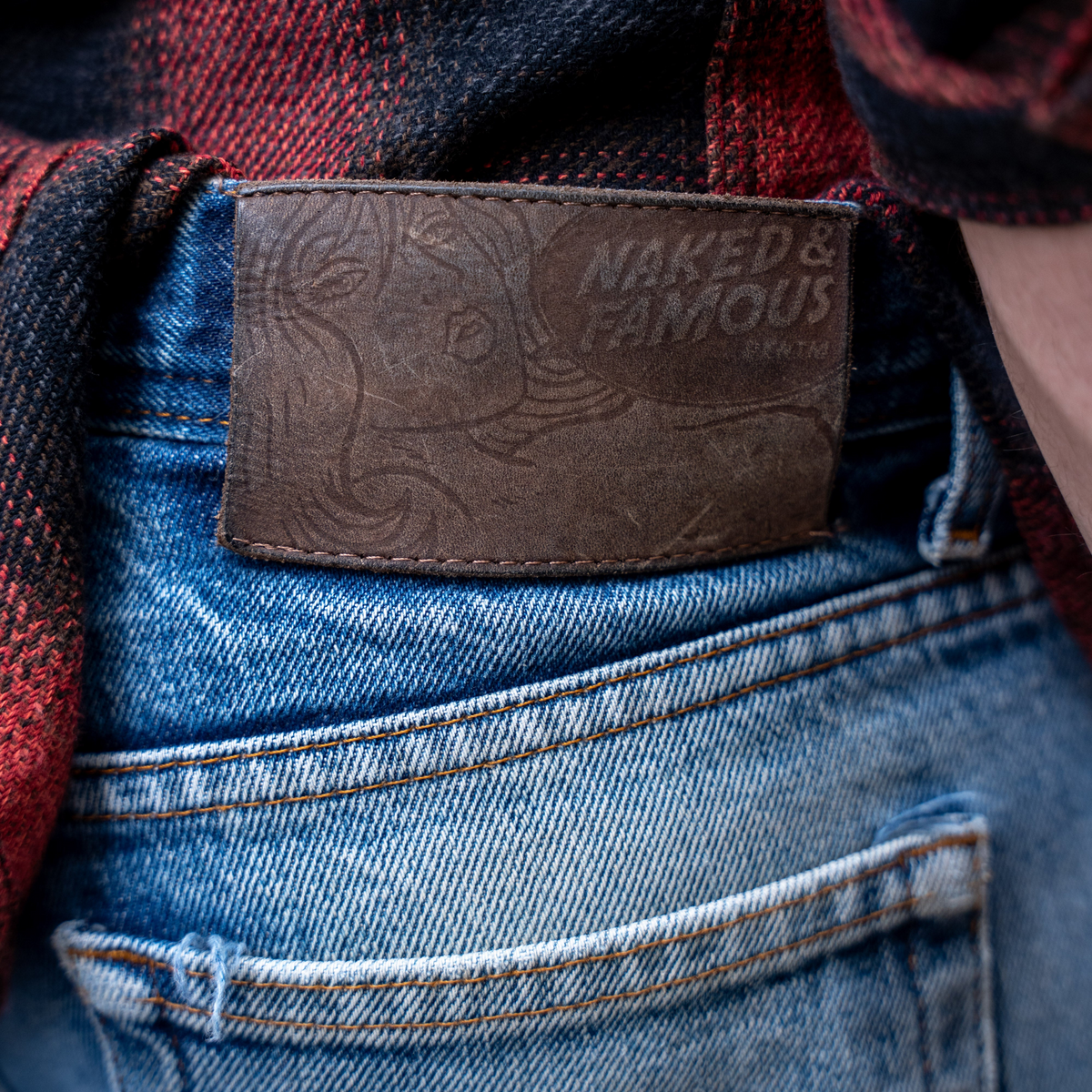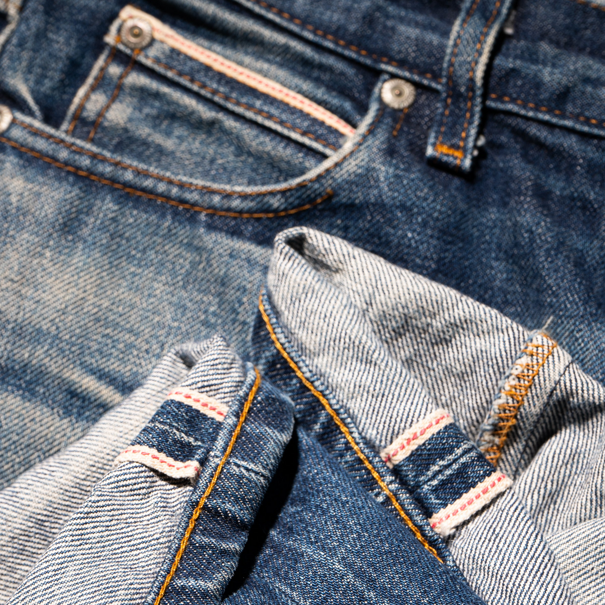 The Dirty Fade Selvedge is a 14.5oz indigo rope dyed Japanese selvedge denim, woven on vintage shuttle looms in a right hand twill construction. The indigo dyed warp yarns start off as a dusty brown shade of cotton. Over time with wear, layers of indigo will begin fade away revealing a brown undertone, hence the name Dirty Fade. Other details include contrast stitching, roughout tan leather patch, red selvedge ID, silver metallic buttons and rivets.