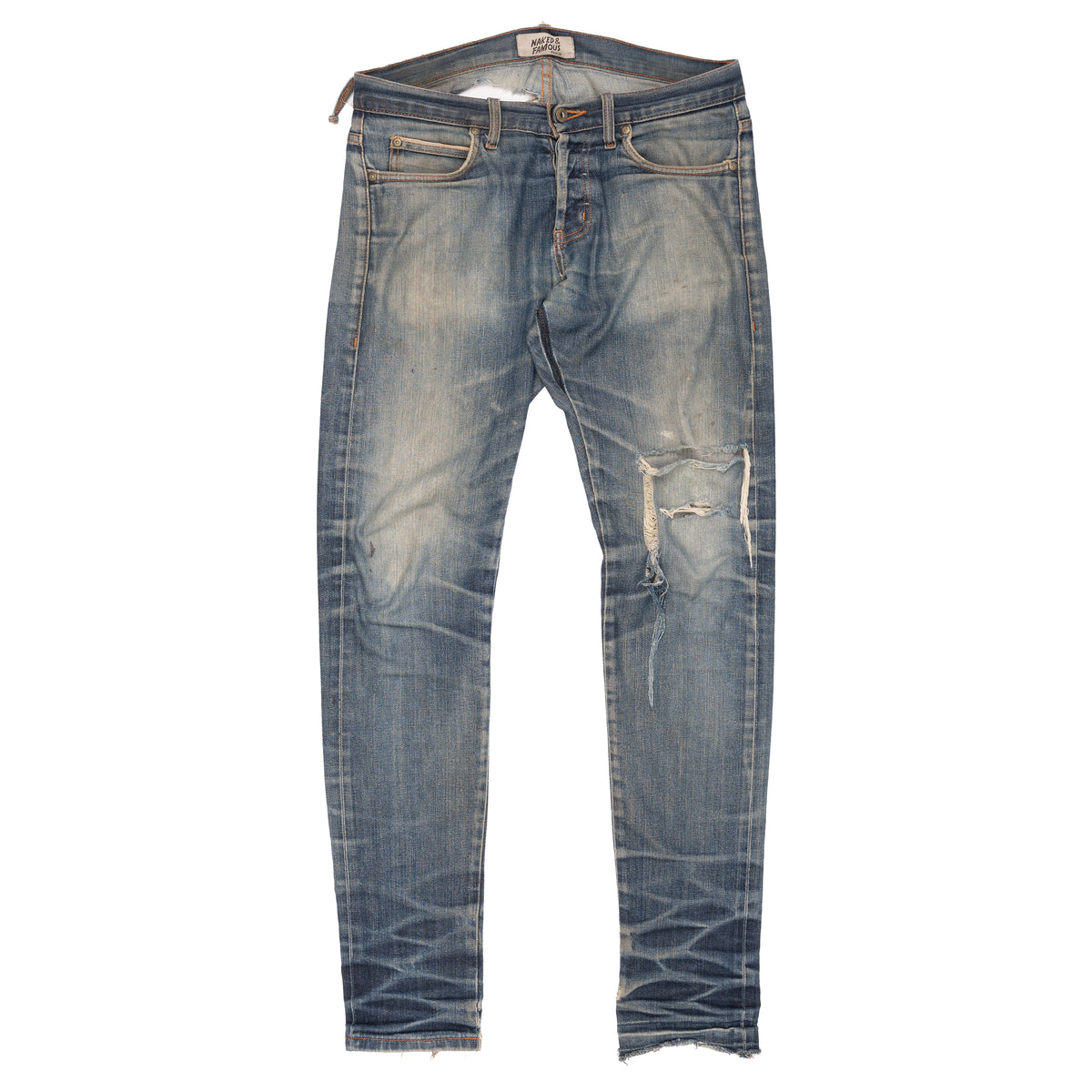 The 11oz Stretch Selvedge is a lightweight indigo rope dyed Japanese selvedge denim, woven on vintage shuttle looms in a right hand twill construction. The fabric is tightly woven giving the jeans a uniform surface appearance. This denim is made with 2% stretch for added comfort, without compromising durability. Other details include contrast stitching, English tan leather patch, red selvedge ID, silver metallic buttons and rivets. The Super Guy is a slim tapered fit; medium rise, slim thigh and taper from the knee to hem.