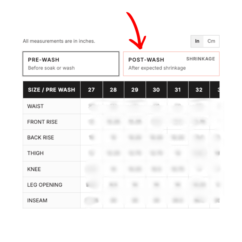 Use the toggle at the top of the size chart to switch between Pre-Wash and Post-Wash values.