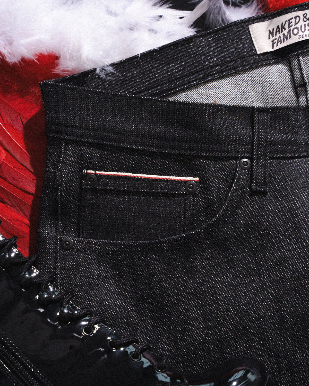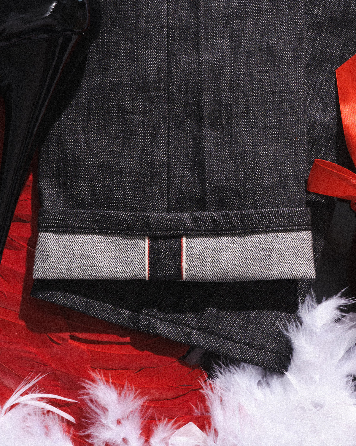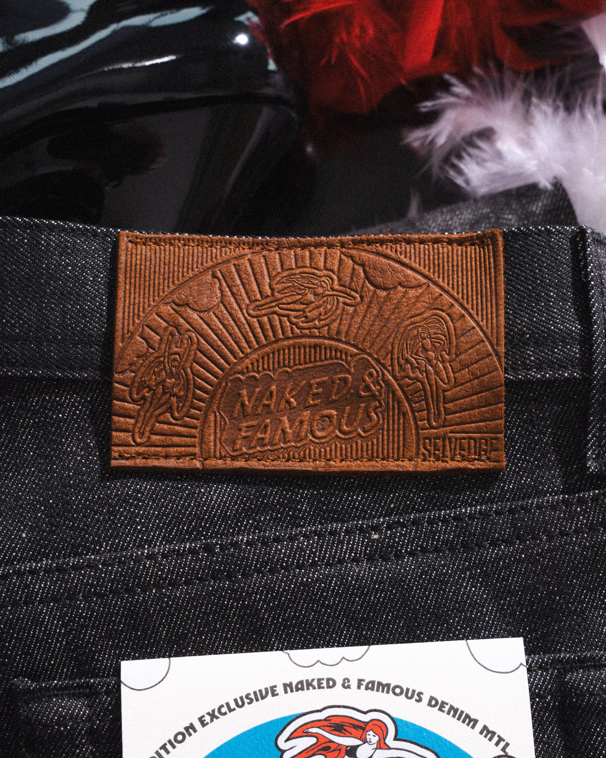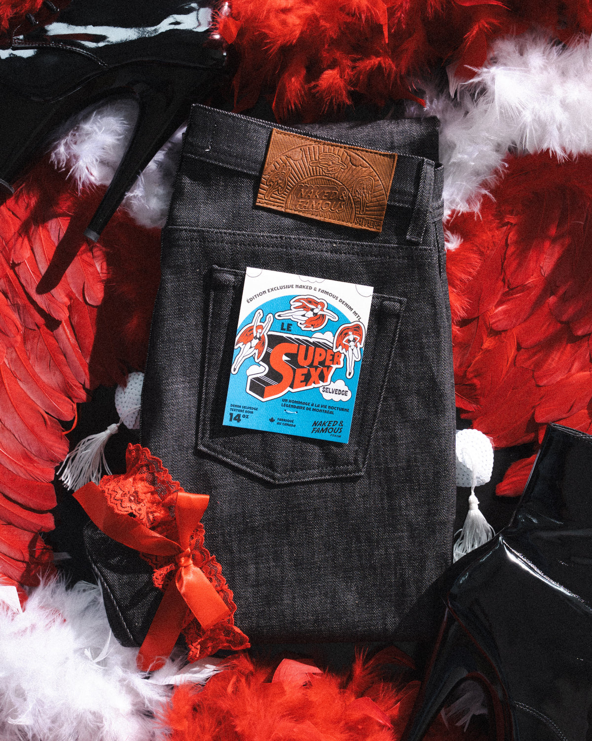 The selvedge detailing in red and white is a nod to the neon glow and vibrant hues that light up Montreal’s nightlife, adding a signature edge that’s immediately striking. Inside, fleur de lys pocket bags celebrate Quebec’s emblematic symbol, a subtle homage to heritage and pride woven right into the garment.